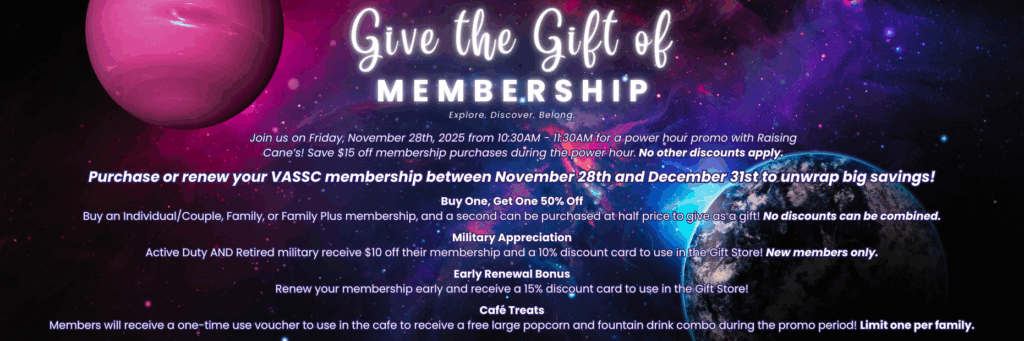 Proudly serving as the official visitor center for NASA’s Langley Research Center, VASSC connects the public to the pioneering research and discoveries shaping our world—and beyond—while sparking curiosity and a lifelong passion for exploration.