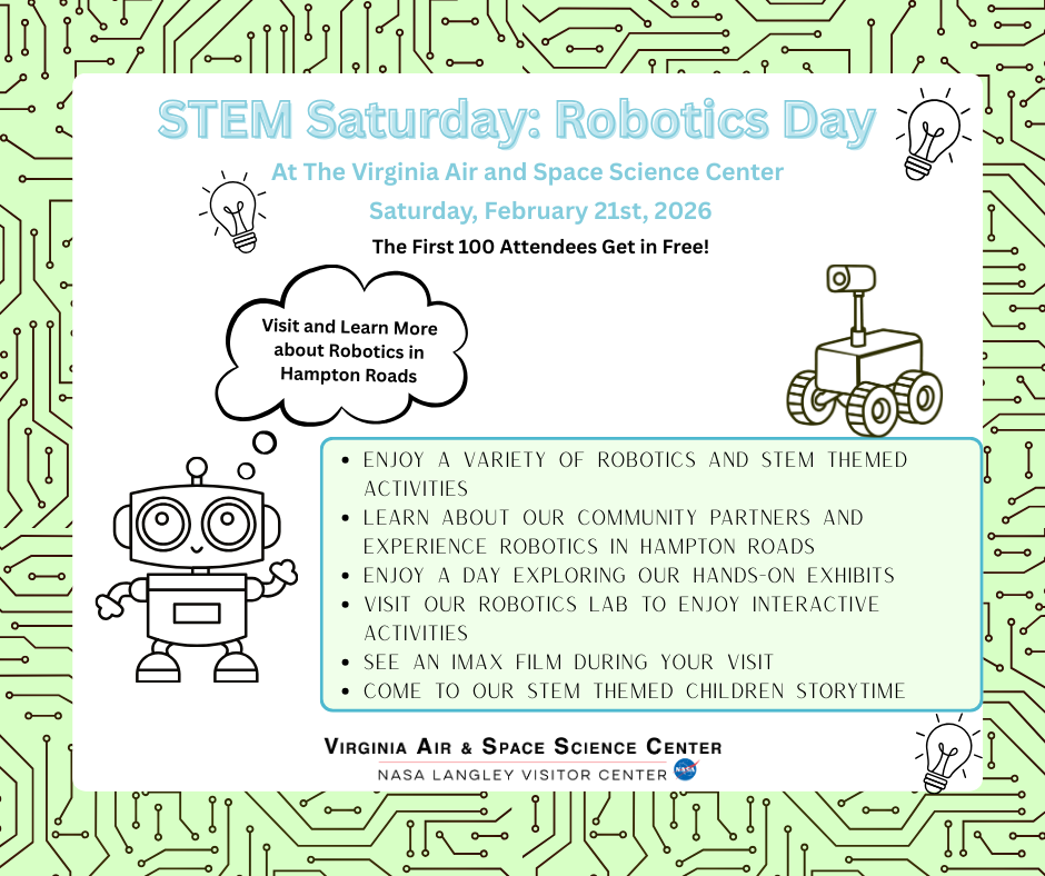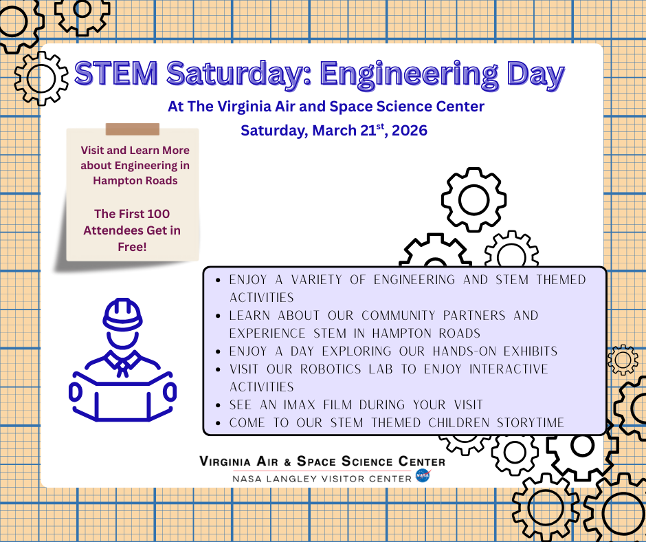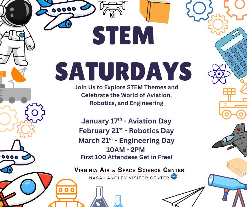 STEM Saturdays is a monthly series at the Virginia Air & Space Science Center focused on hands-on learning in science, technology, engineering, and mathematics. Each event highlights a different STEM theme and connects families with real-world applications through exhibits, activities, community partners, and films. Events run from 10AM to 2PM, and the first 100 attendees receive free admission.