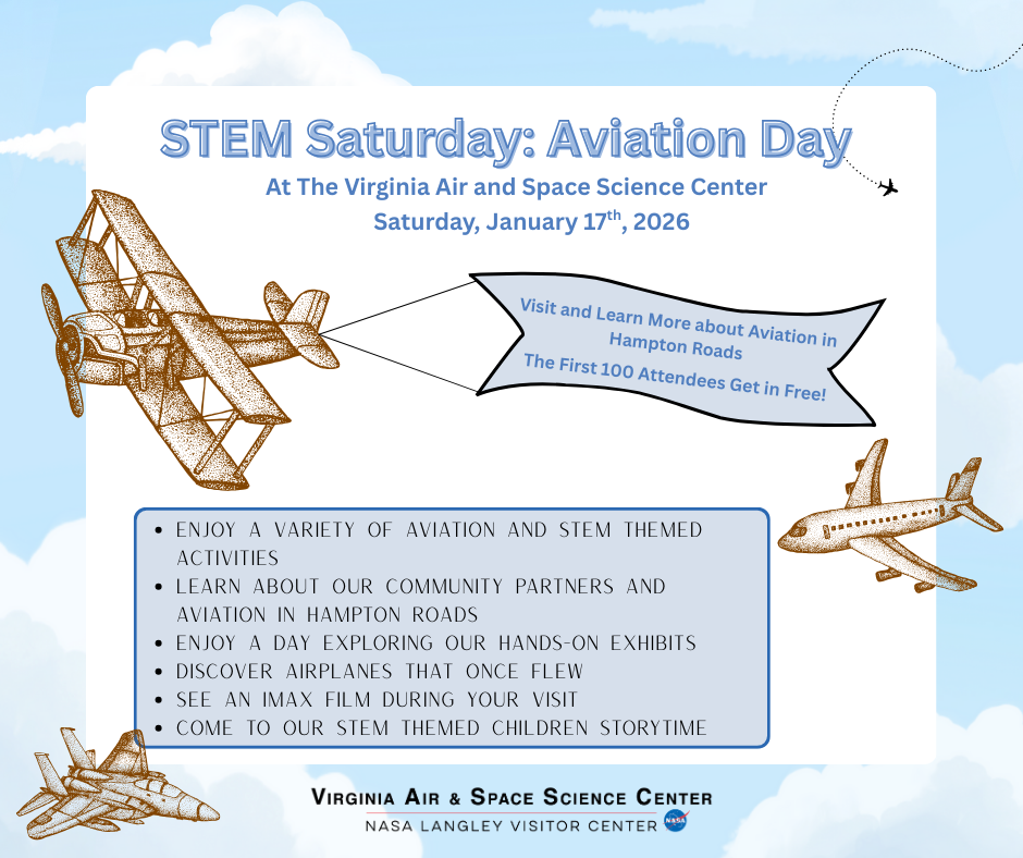 Aviation Day explores the science and history of flight in Hampton Roads. Visitors can participate in aviation-themed STEM activities, learn about local aviation partners, explore hands-on exhibits, view historic aircraft, attend STEM-themed children’s storytime, and watch an IMAX film during their visit.